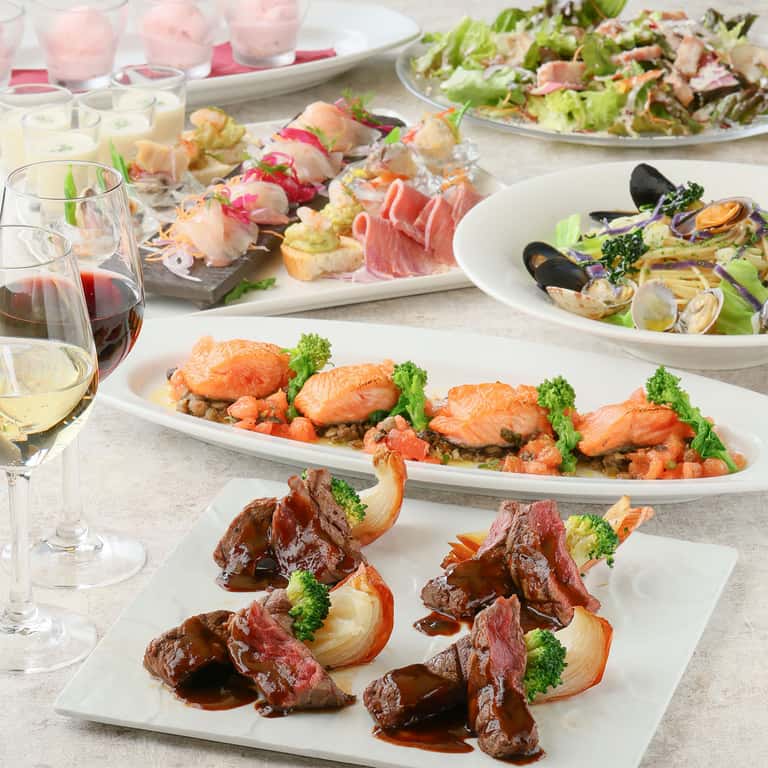 歓送迎会、少人数飲み会、同窓会、懇親会予約受付中♪旬の素材を使用した前菜盛り合わせに、パスタ、魚料理がついてメインには国産牛フィレ肉のビステッカを堪能!ワンランク上の飲み会、宴会にオススメ!
